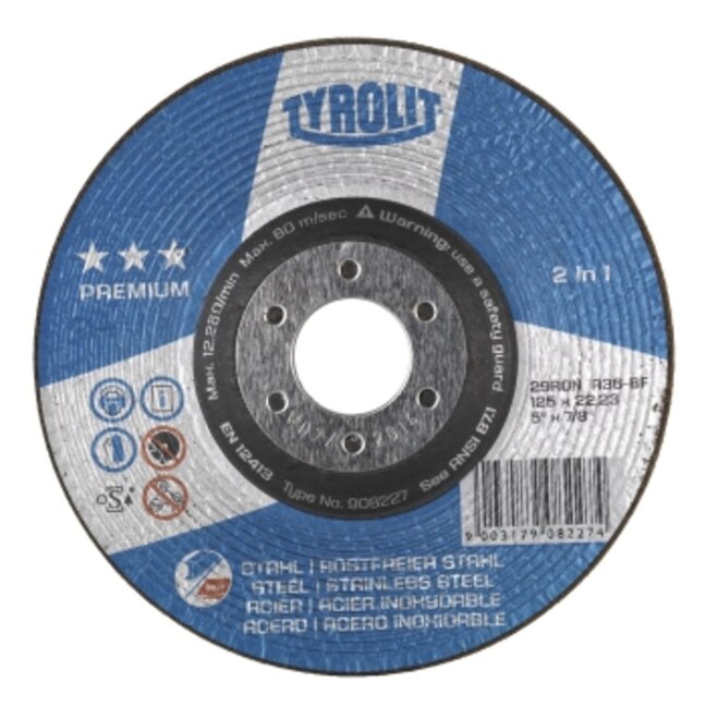 TYROLIT-Trennscheibe 41 - 125 x 1 x 22,23 mm Premium*** - Spez.: A60Q-BFP Stahl + Inox Typ-Nr.: 34332792